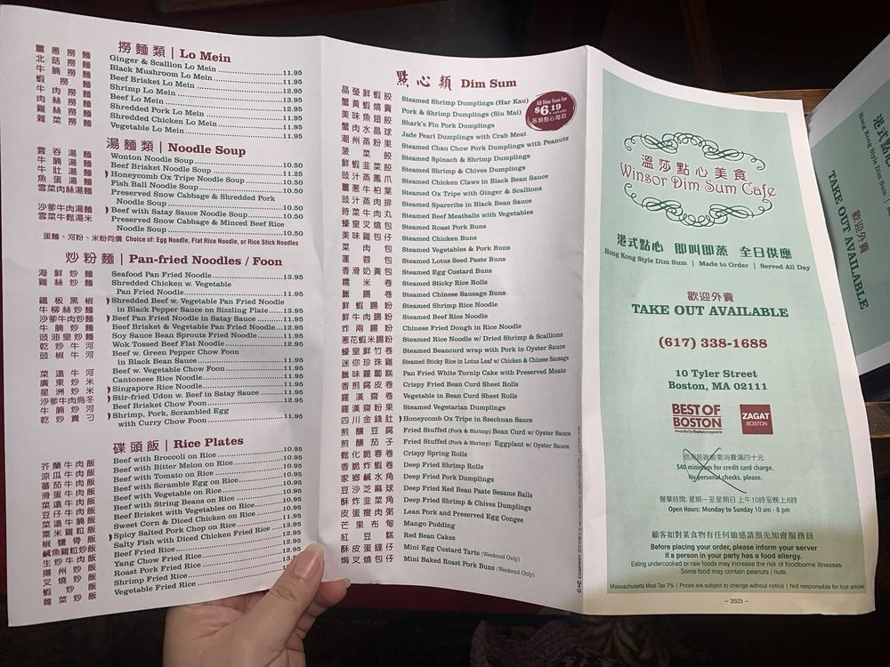 Winsor Dim Sum Cafe located in Boston's Chinatown offers a wide range of traditional dim sum and Chinese dishes. With options for pescatarians, vegans, and vegetarians, the menu includes delicious congee like Lean Pork and Preserved Egg Congee and flavorful soups such as Wonton Soup and Hot and Sour Soup. Customers rave about the Crab Rangoon, Steamed Pork Bun, and Fried Shrimp and Chive Dumpling. The ordering process via a sheet is user-friendly and the food arrives quickly. The cozy ambiance is perfect for groups and families, making it a go-to spot for lunch or a casual dinner. Don't miss the turnip cake with sauce and the tasty dim sum items. Winsor Dim Sum Cafe is a must-visit for authentic Chinese cuisine in Boston's bustling Chinatown.